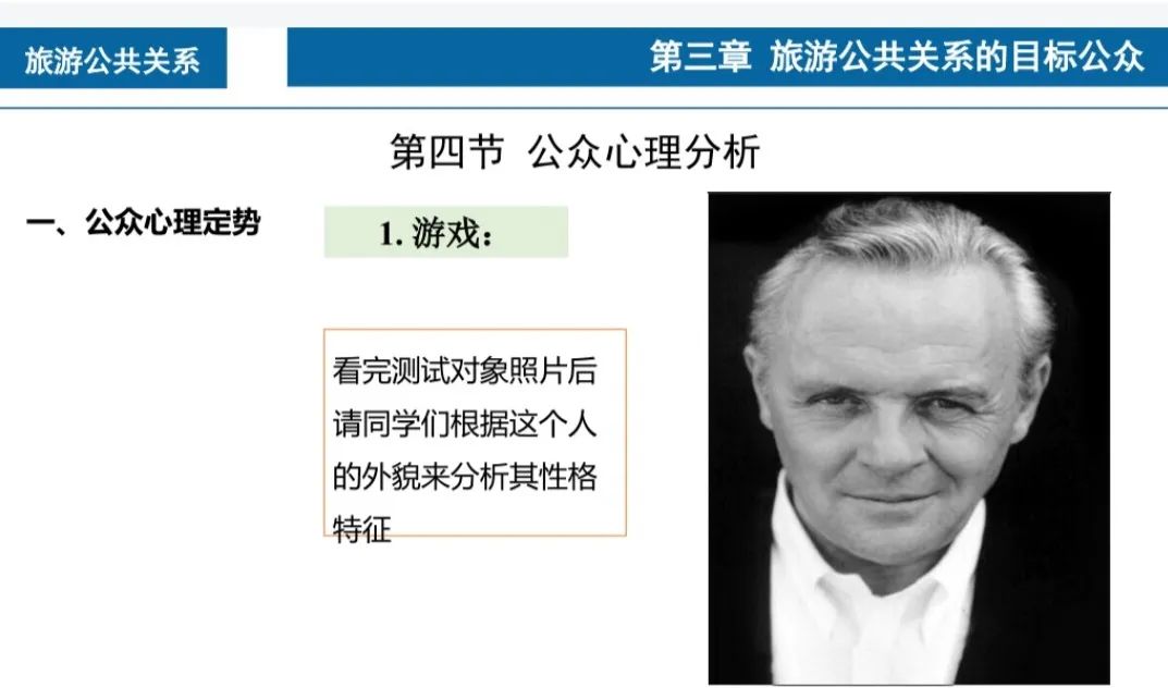 一个十恶不赦、罪行累累的逃犯?一个面露凶相、阴险恶毒的老者?还是一个才智过人、善于创新的发明家?……当学生们凝视着那张西装革履、笑容可掬的特写照片时,心中不禁升起这样的疑问。倘若给你一张照片,让你揣测图中人物的性格轮廓,你是否会好奇这究竟是哪门课程的独特教学方式呢?答案揭晓——这是旅游公共关系课程的一次课堂互动,你是否已经猜中了呢?