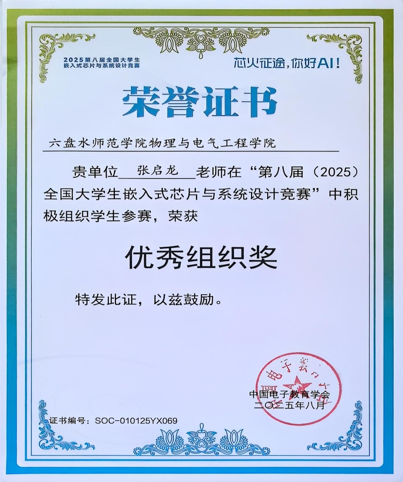 近日,第八届(2025)全国大学生嵌入式芯片与系统设计竞赛圆满落幕。因出色的赛事组织工作与显著的人才培养成效,物理与电气工程学院张启龙老师被主办方中国电子教育学会授予“优秀组织奖”表彰。这一荣誉充分体现了学院在嵌入式领域教学水平和竞赛组织能力的持续提升。