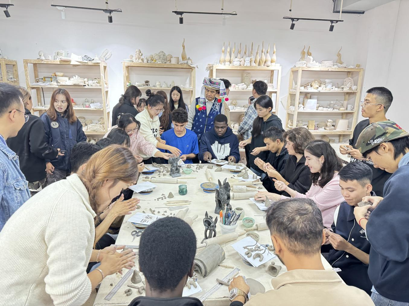 文化体验环节,在陶艺老师——六盘水市市级黑陶非遗传承人侯说和陶艺社学生们的指导下,国际学生认真学习中国陶瓷制作技艺,并动手实践,制作出一个个生动可爱的“瓦猫”。