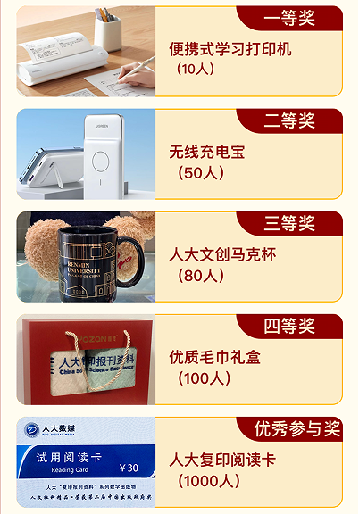 2、符合抽奖资格的参加人员,在完成拼图活动后,主办方从所有符合抽奖资格的参加人员中,随机抽出获奖者。拼图完整,并成功获取证书读者有资格抽取1等奖,拼图数为4块的读者有资格抽取2等和3等奖,拼图数量为3块的读者有资格抽取4等奖和优秀参与奖。获奖名单将通过“人大复印库”公众号统一公布,敬请关注。