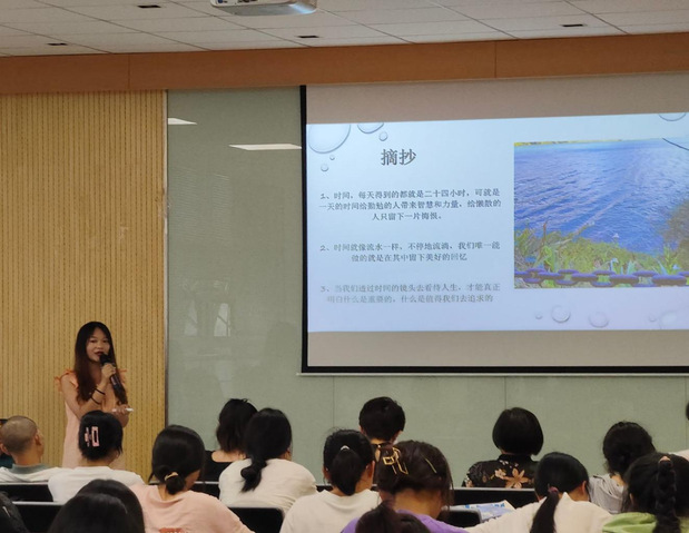 卿雨露同学分享了革命烈士方志敏的散文《可爱的中国》,她呼吁在场师生要学习革命先辈勇于奋斗的精神和坚定不移的意志,“不要悲观,不要畏馁,要奋斗!要持久的艰苦地奋斗!”宋伟同学分享的是一部了解中国节气文化的入门书《时间之书》,她说她喜欢其中一句富有哲理的话:“年轻人,你的职责是平整土地,而非焦虑时光。你做三四月的事,在八九月自有答案。”陆薛芳同学推荐的是中国当代作家张嘉佳的长篇小说《云边有个小卖部》,她用精美的PPT展示书中的情节,也分享了自己的故事,并感悟:我们要在有限的时间里,去无限地爱着我们身边的人。蒋开明分享的是阿德勒哲学思想心理丛书《被讨厌的勇气》,她利用思维导图的方式带着大家思考如何能够在繁杂的日常琐碎和复杂的人际关系中用自己的双手获得真正的幸福。