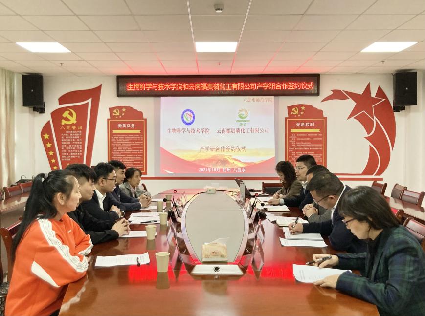 10月15日下午,生物科学与技术学院和云南福贵磷化工有限公司在奥学楼623会议室进行座谈,并签署产学研合作框架协议。云南福贵磷化工有限公司总经理翁健晖、副总经理翁章银和生物科学与技术学院党委书记王家理、院长熊荣川、副院长方玉梅、党委副书记匡其羽出席签约仪式。