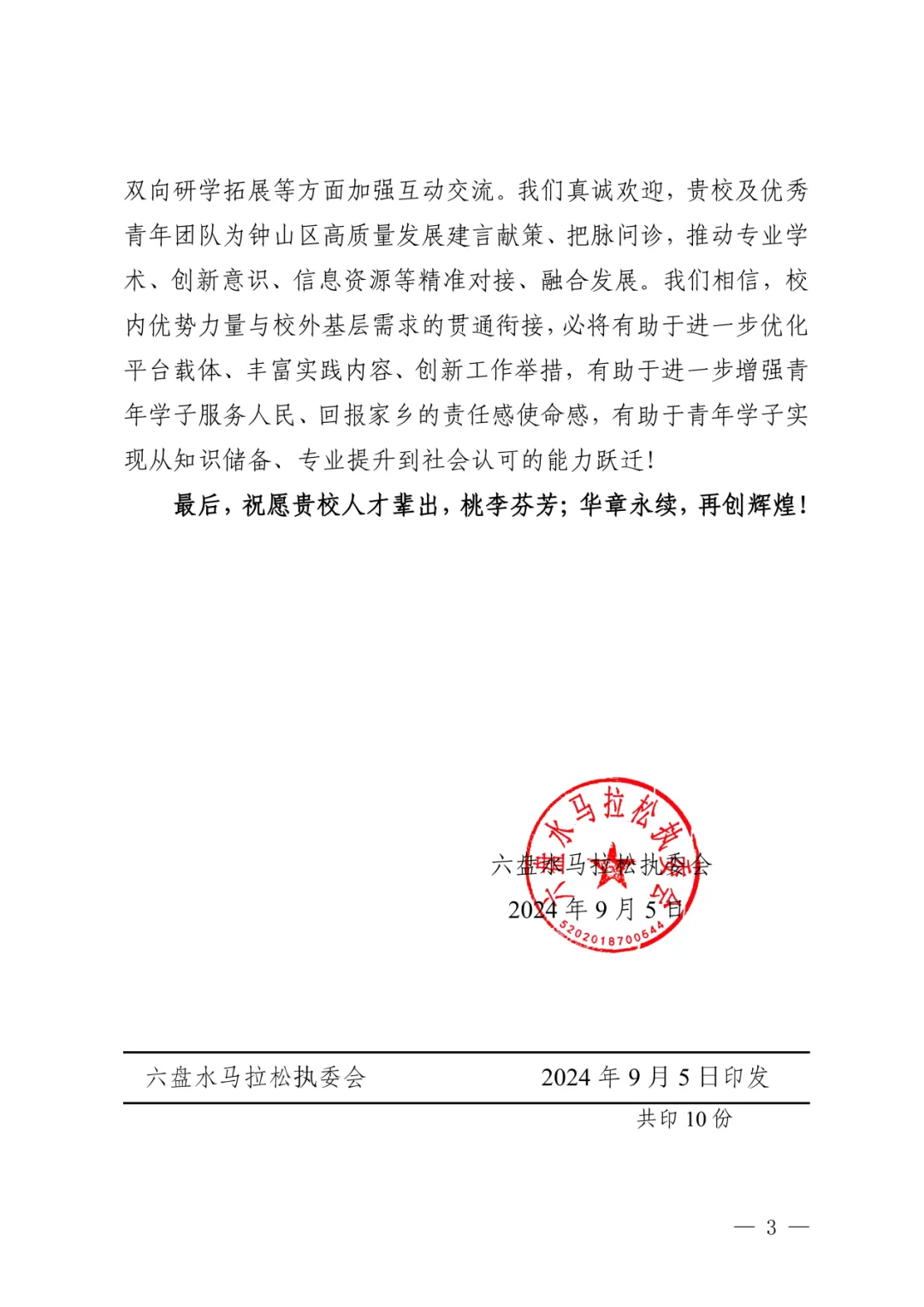 近日,我校收到了六盘水马拉松执委会的感谢信,执委会高度认可我校在2024六盘水马拉松赛志愿服务中的服务管理工作,并对志愿者们的无私奉献和专业服务表示衷心的感谢。