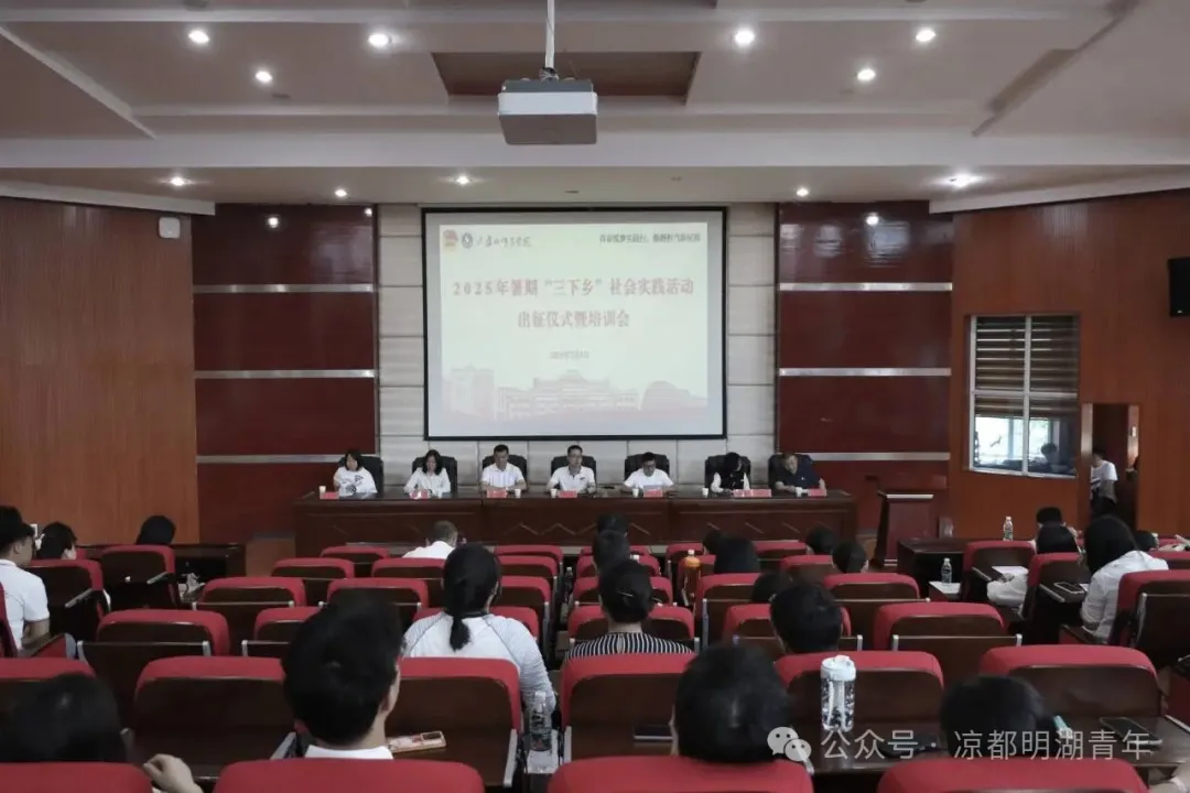 7月5日,我校于博学楼知行讲堂开展暑期“三下乡”社会实践活动出征仪式暨培训会。校党委委员、副校长牛伟,教务处处长代稳,保卫处处长余征,党委学生工作部副部长张艳蓉,校团委副书记陈文辉,党委宣传部文化建设科科长谢春霞,以及各学院分管学生工作院领导、团委书记、各实践团队成员和指导教师参加,仪式由校团委书记杨毅主持。